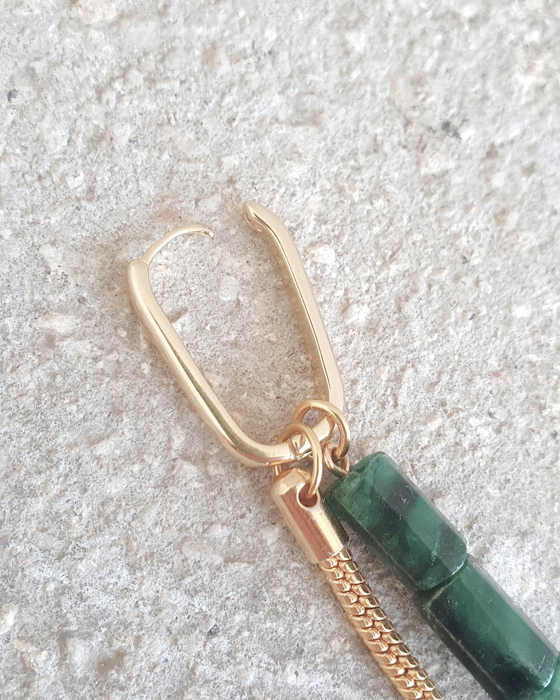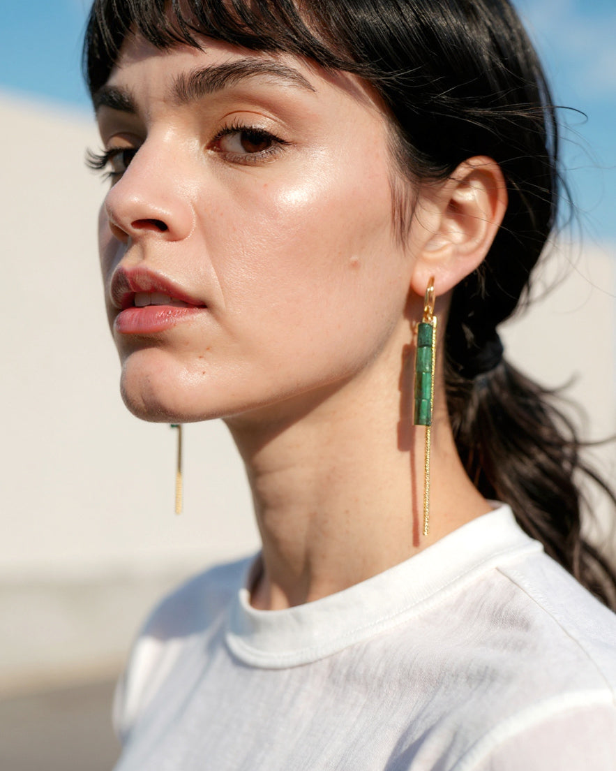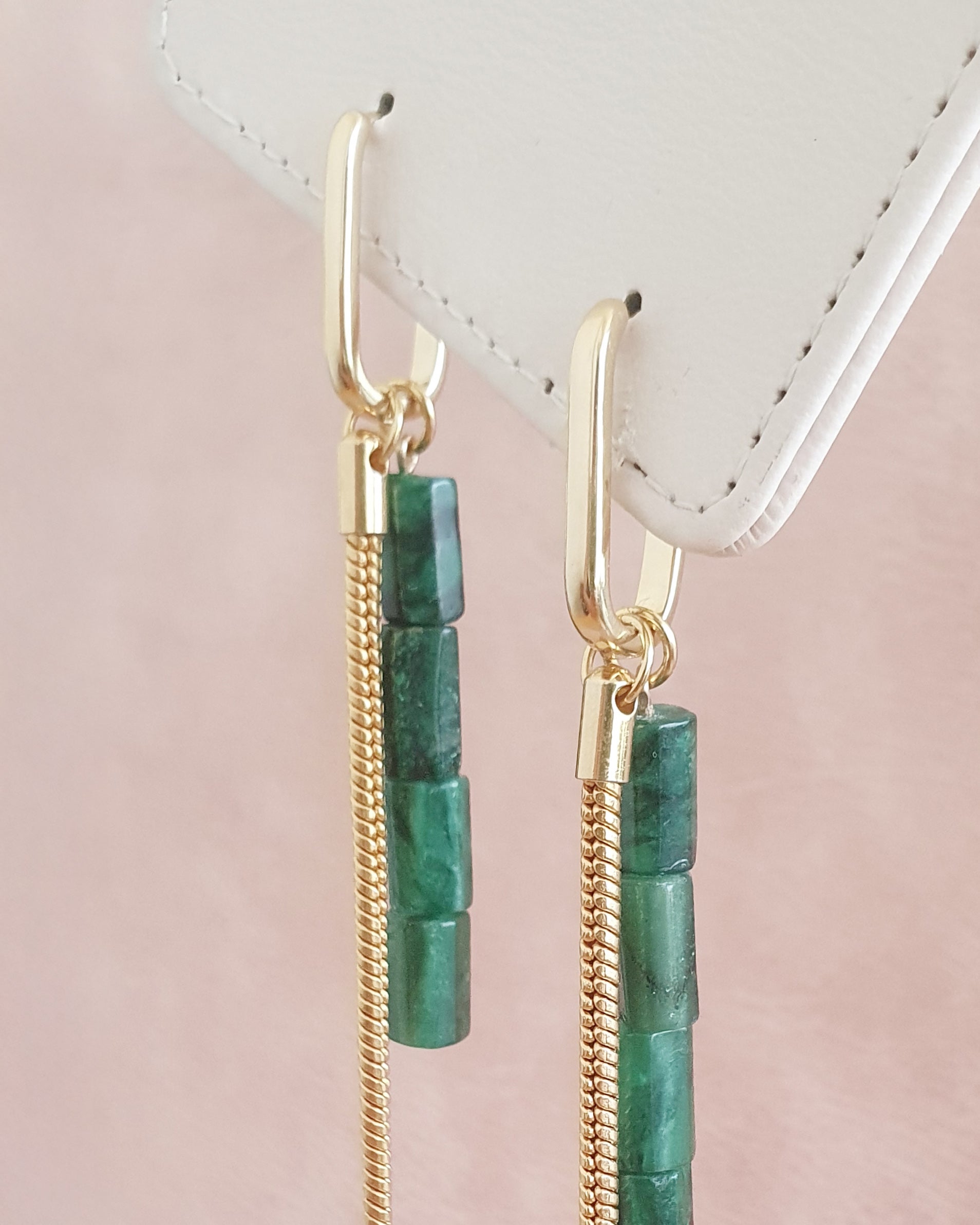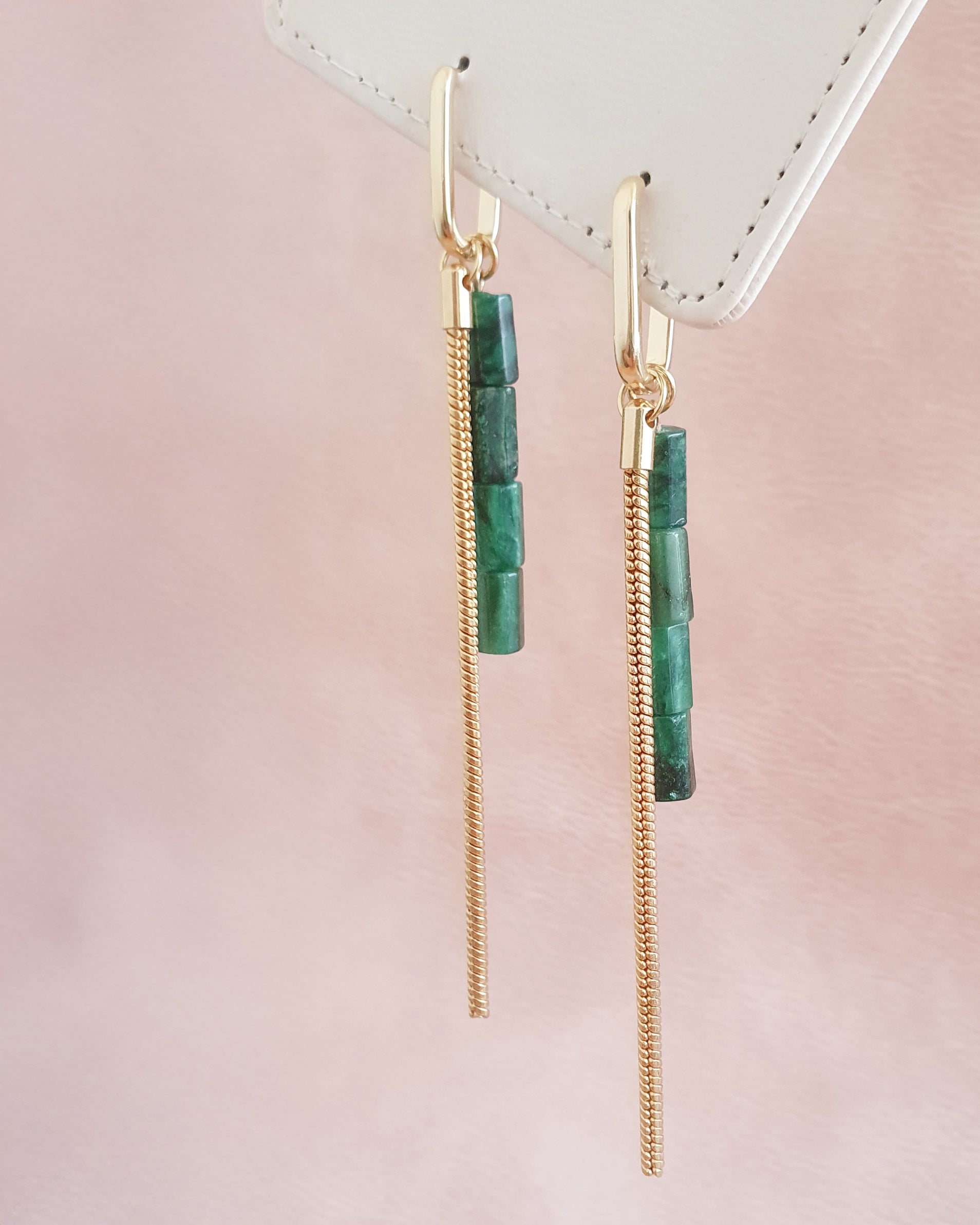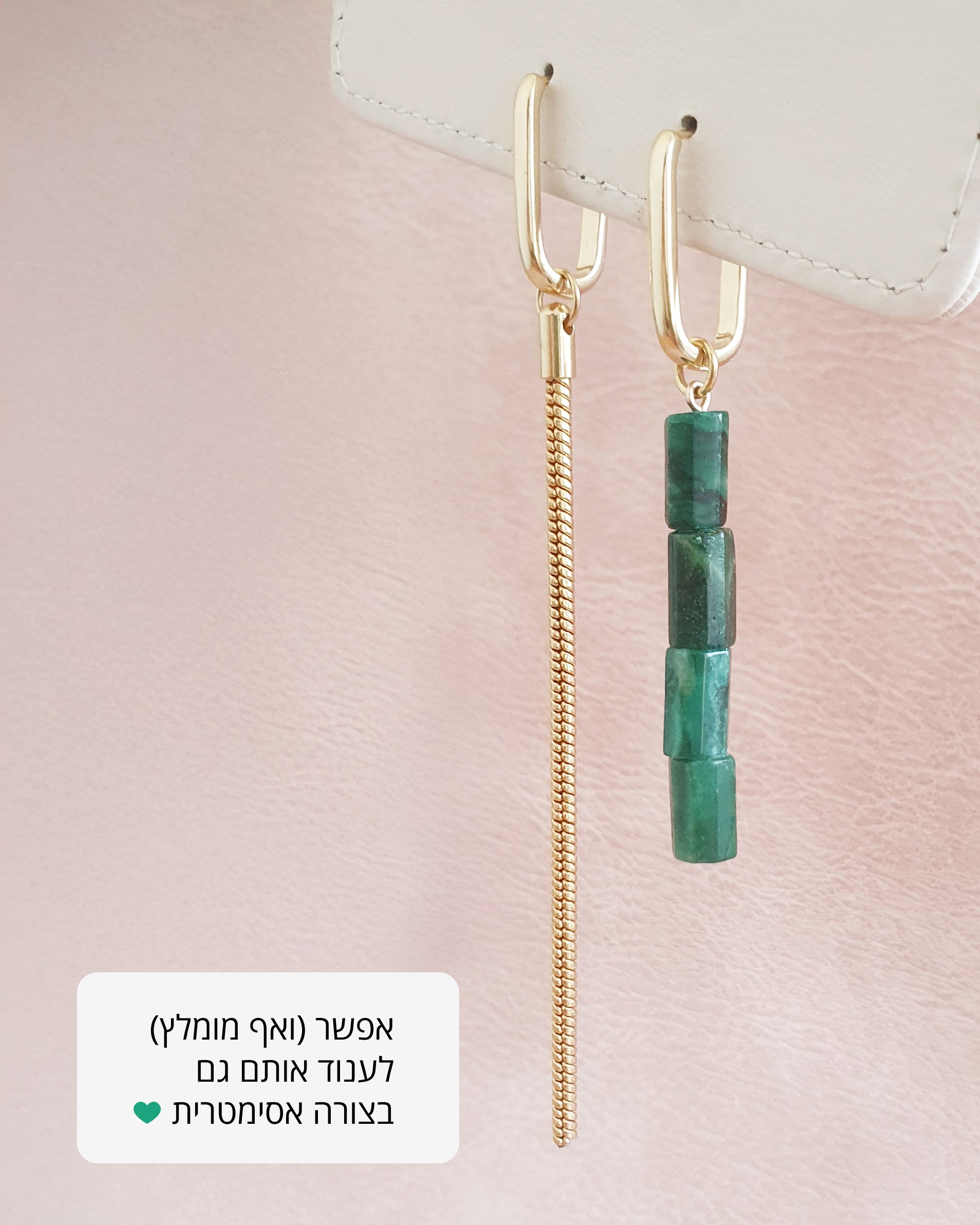 עגילים תלויים על חישוק אובלי זהוב בשילוב אבני אמרלד בגוונים עשירים של ירוק.