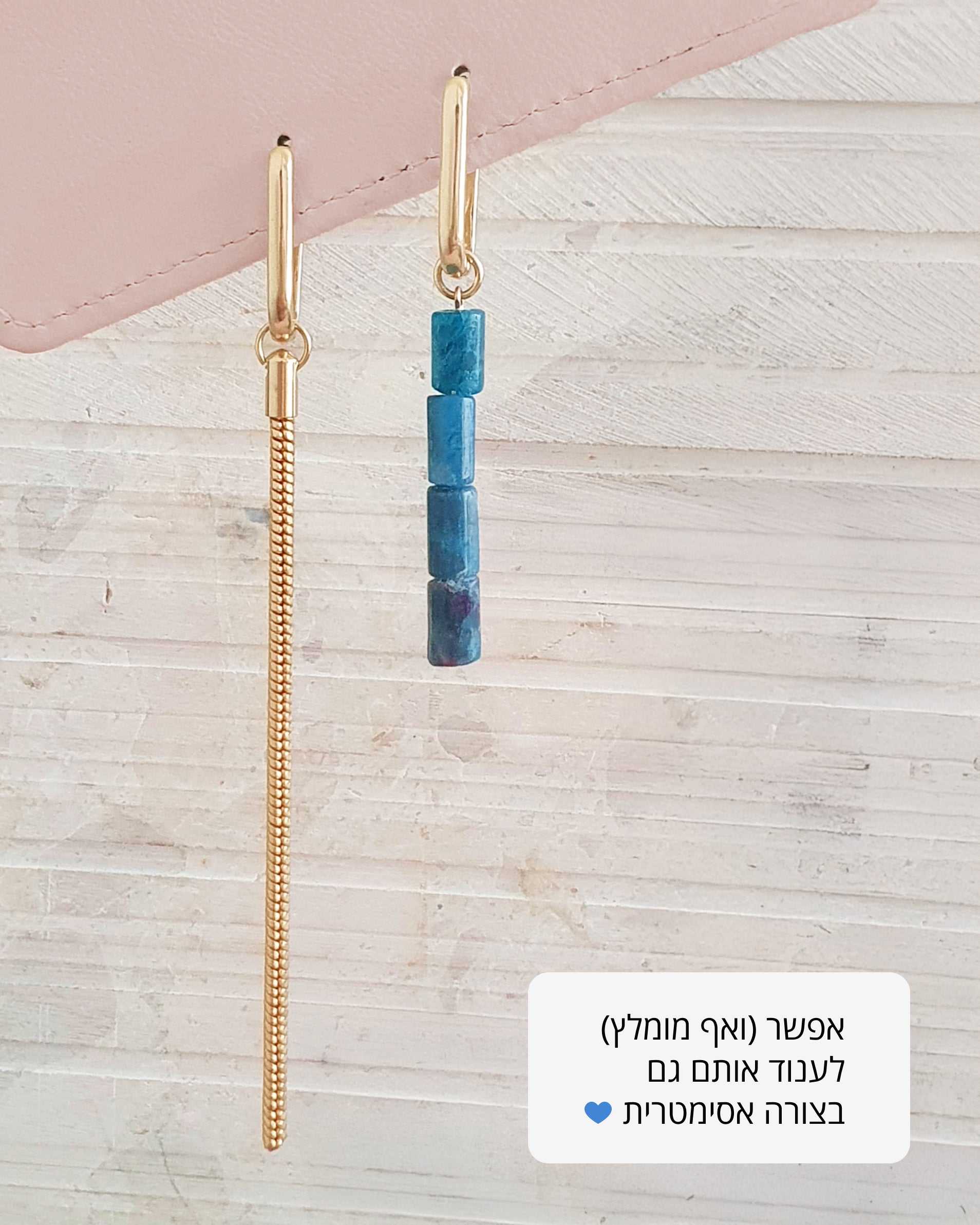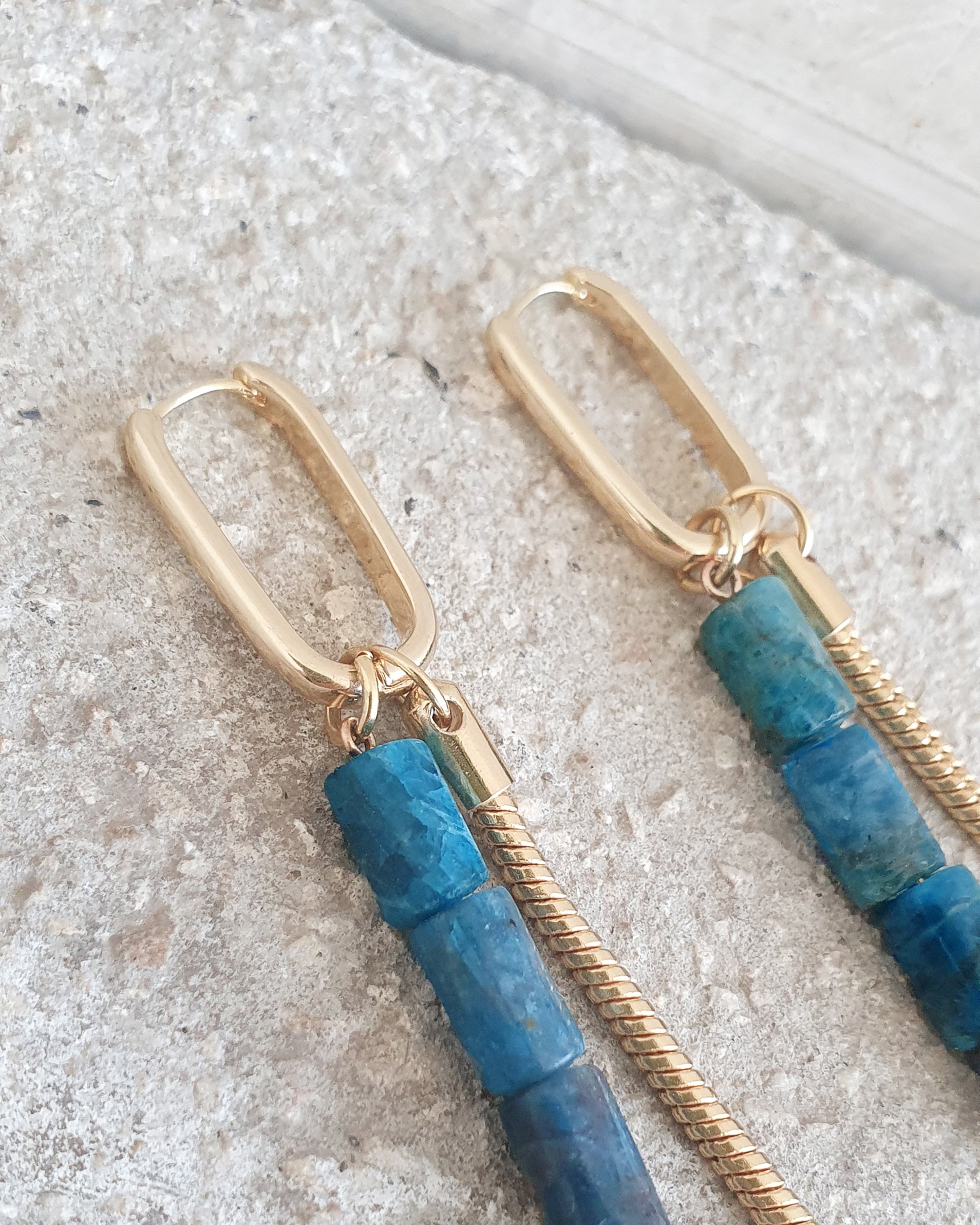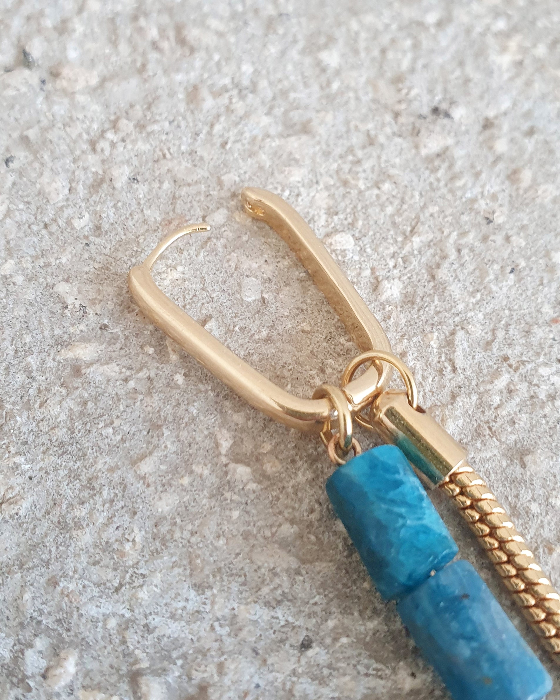 עגילים תלויים על חישוק אובלי זהוב בשילוב אבני אפטייט בגווני כחול וטורקיז.