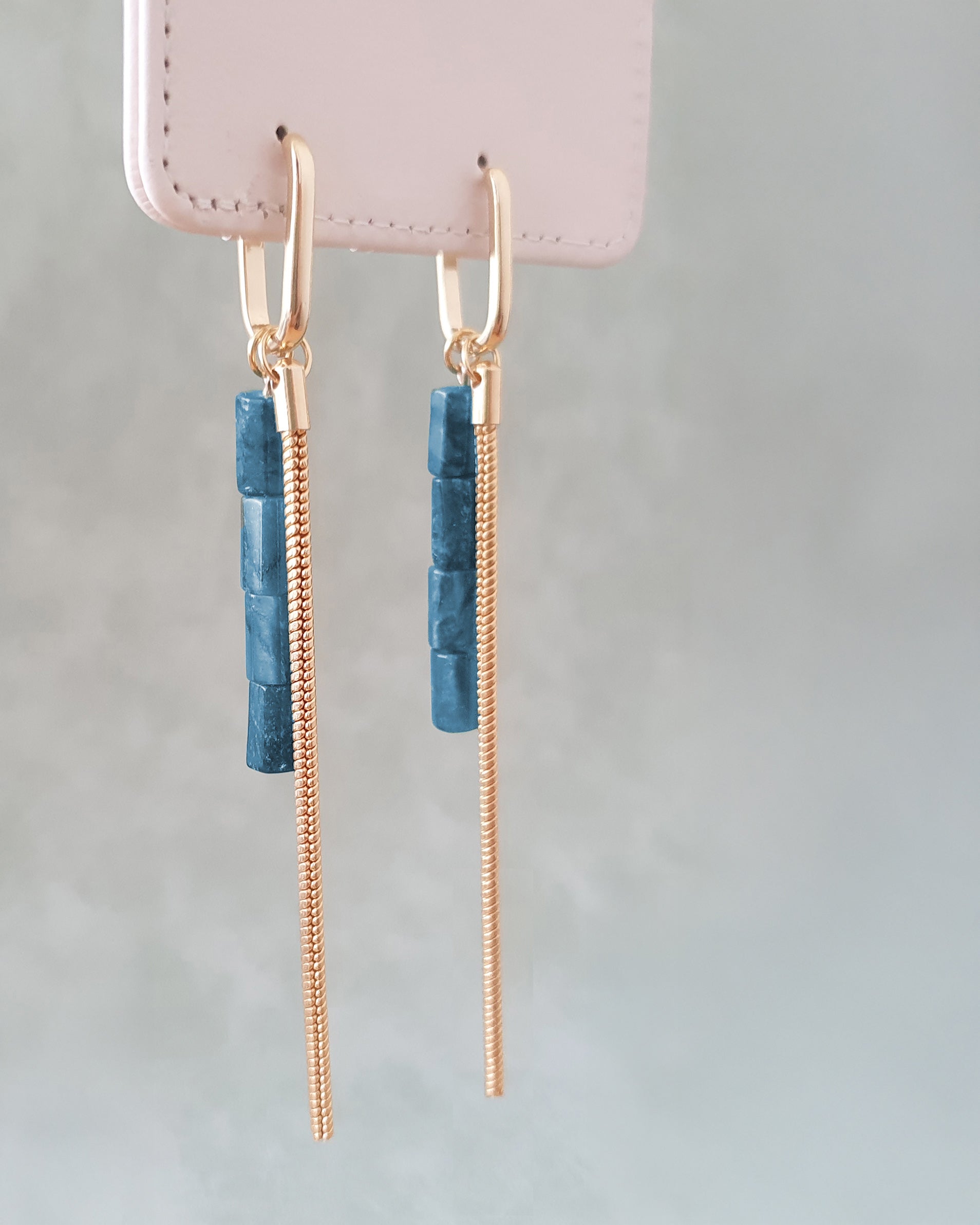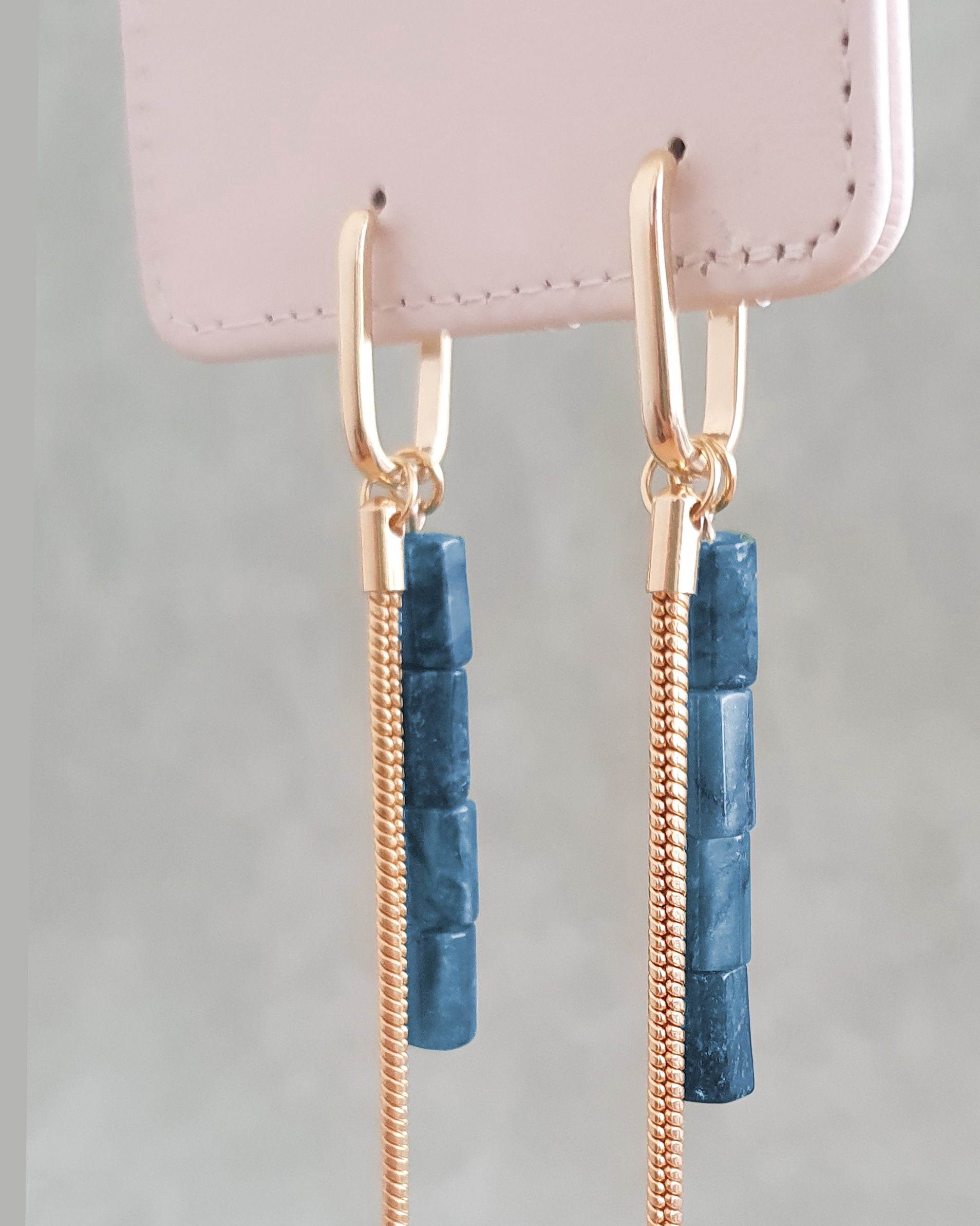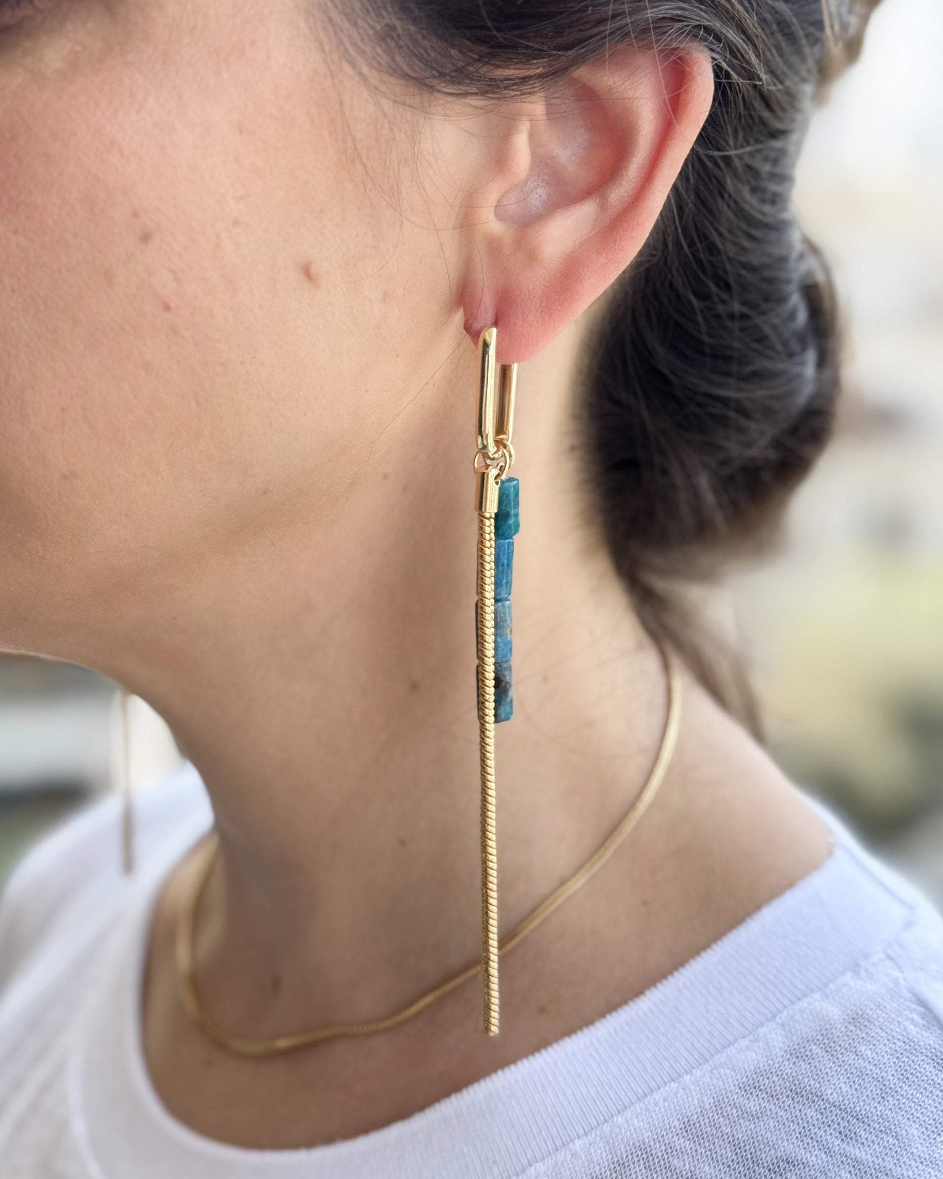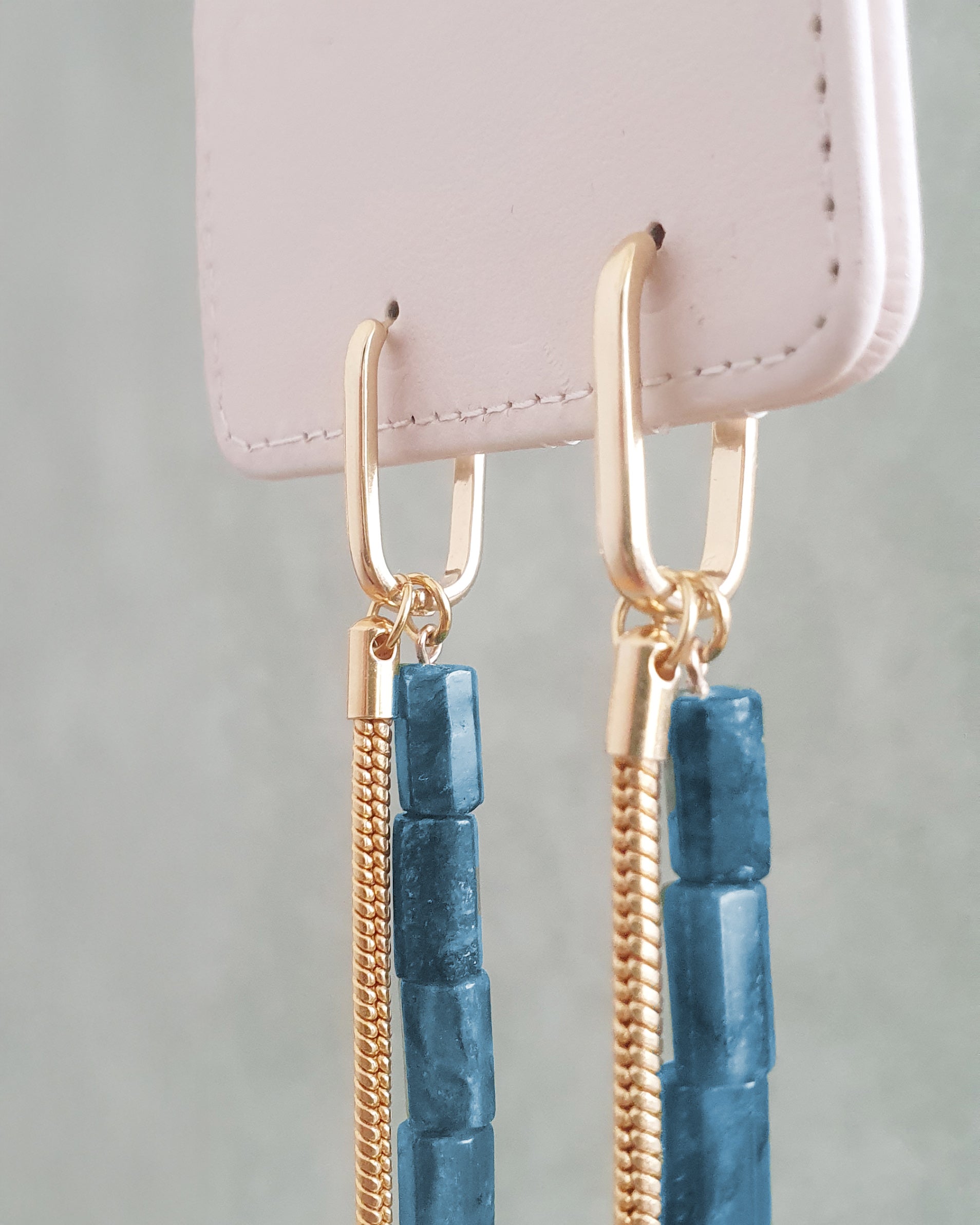 עגילים תלויים על חישוק אובלי זהוב בשילוב אבני אפטייט בגווני כחול וטורקיז.