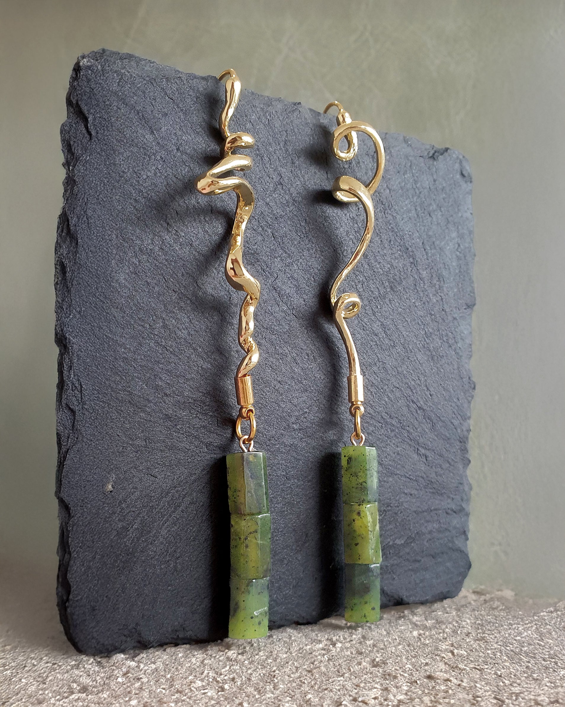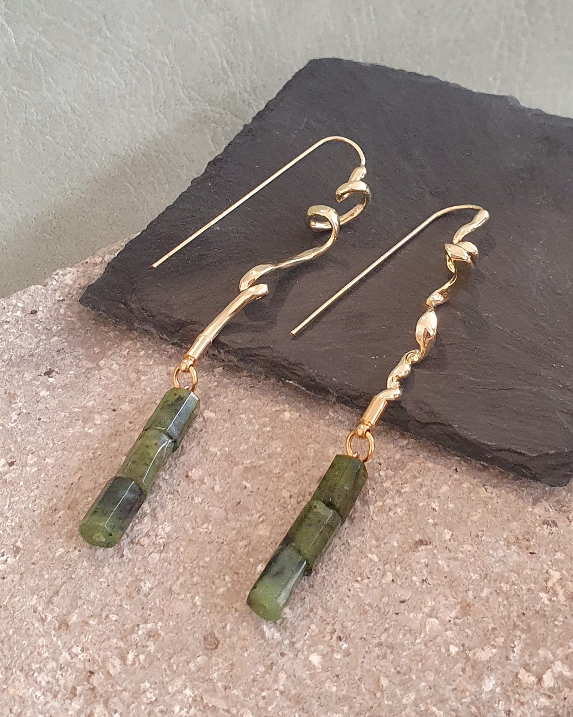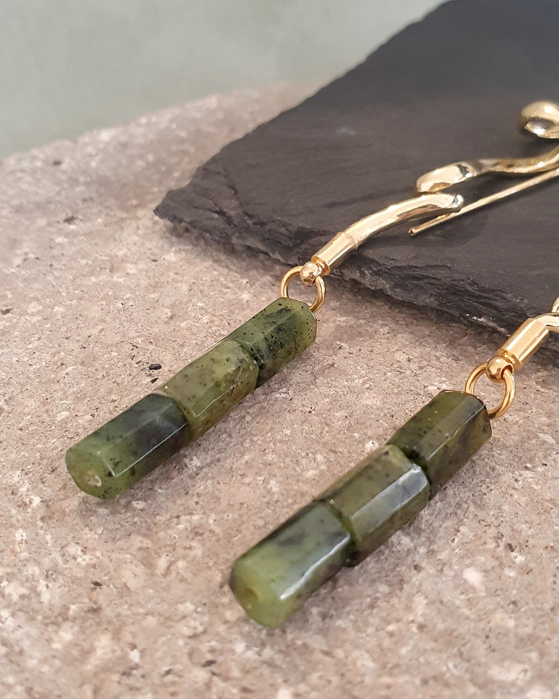 עגילים תלויים מאלמנט זהוב בשילוב אבני ג'ייד קנדי בגוונים ירוקים.