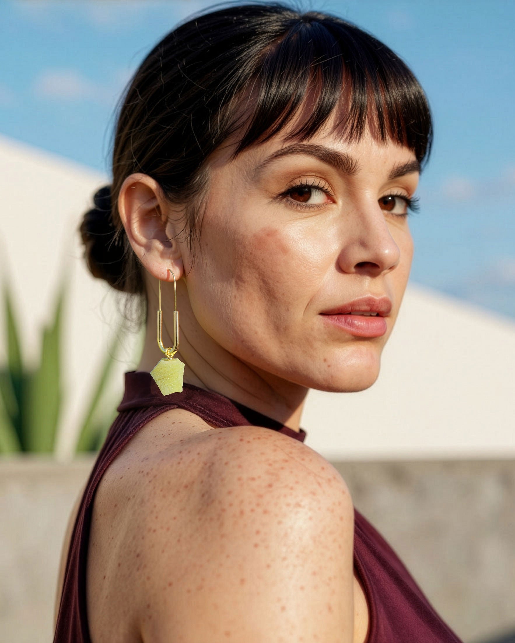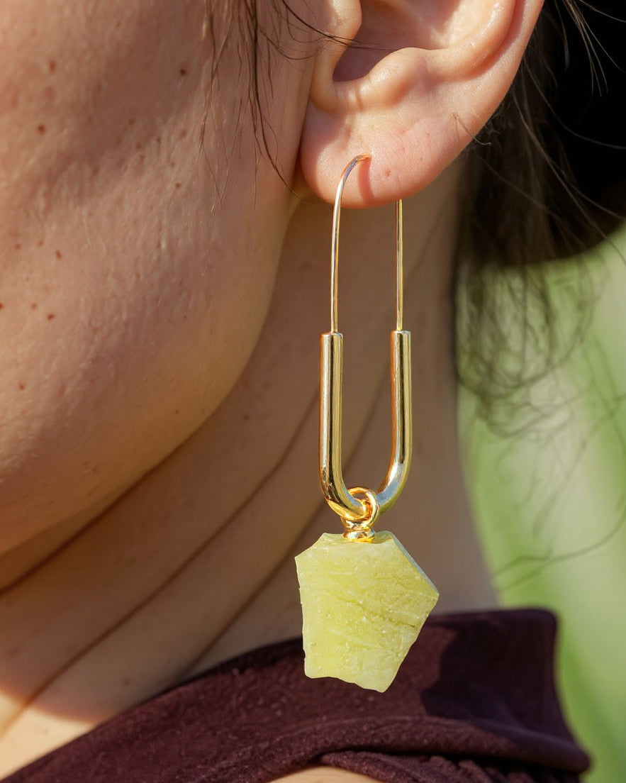 עגילי חישוק מוארכים בשילוב אבני ג’ייד לימון בגימור גולמי.