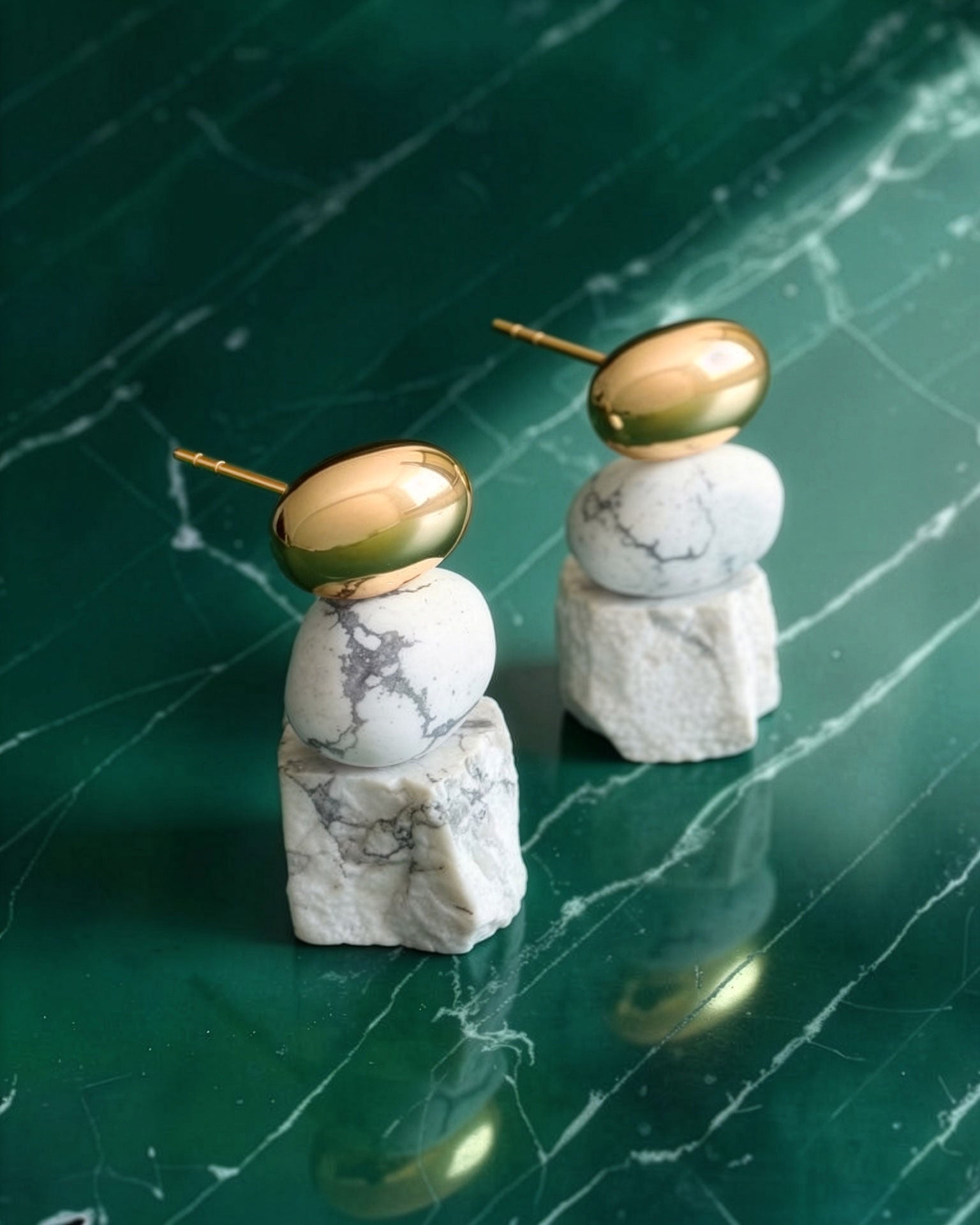 עגילים צמודים מוזהבים בשילוב אבני האולייט בשני סוגי גימורים.