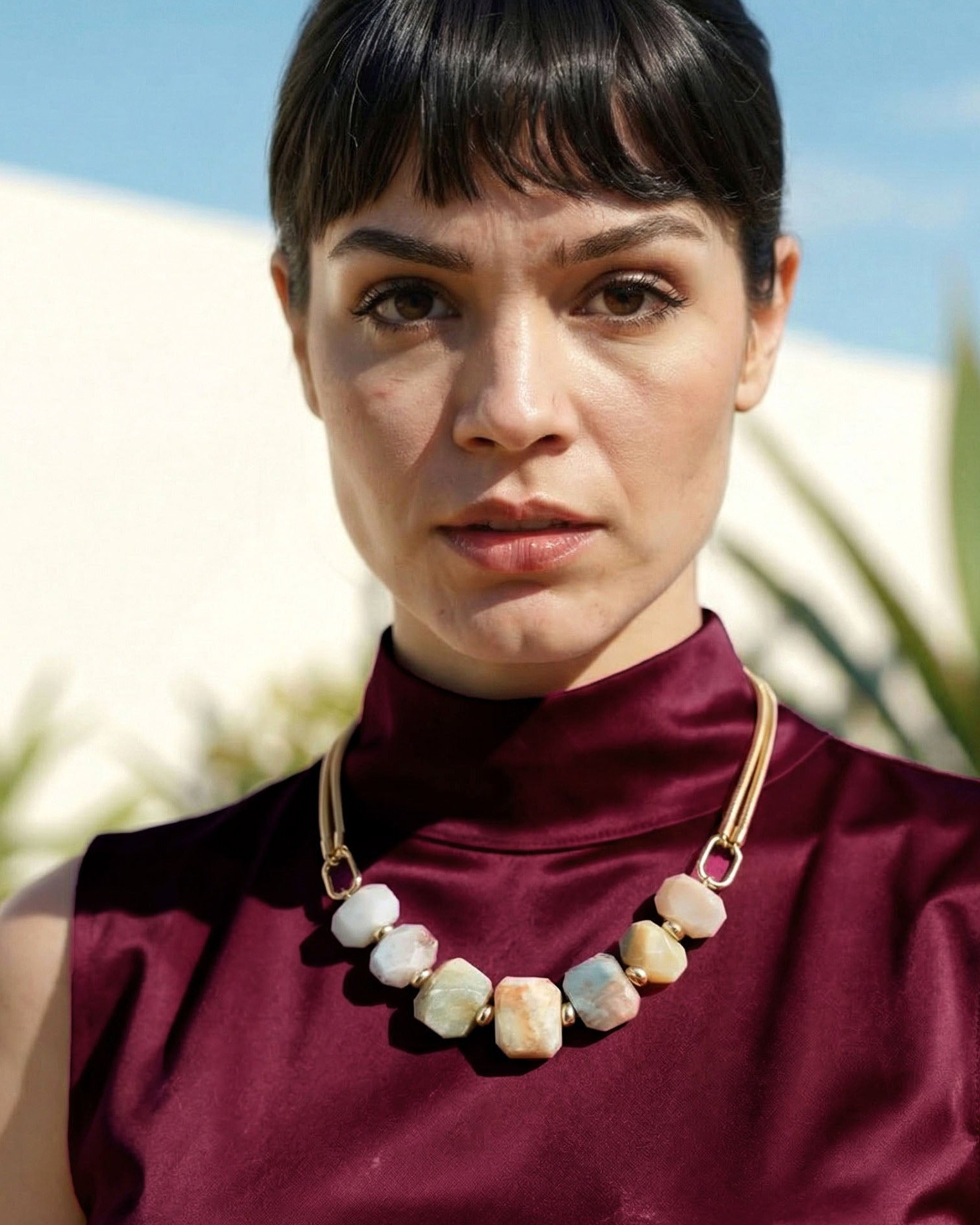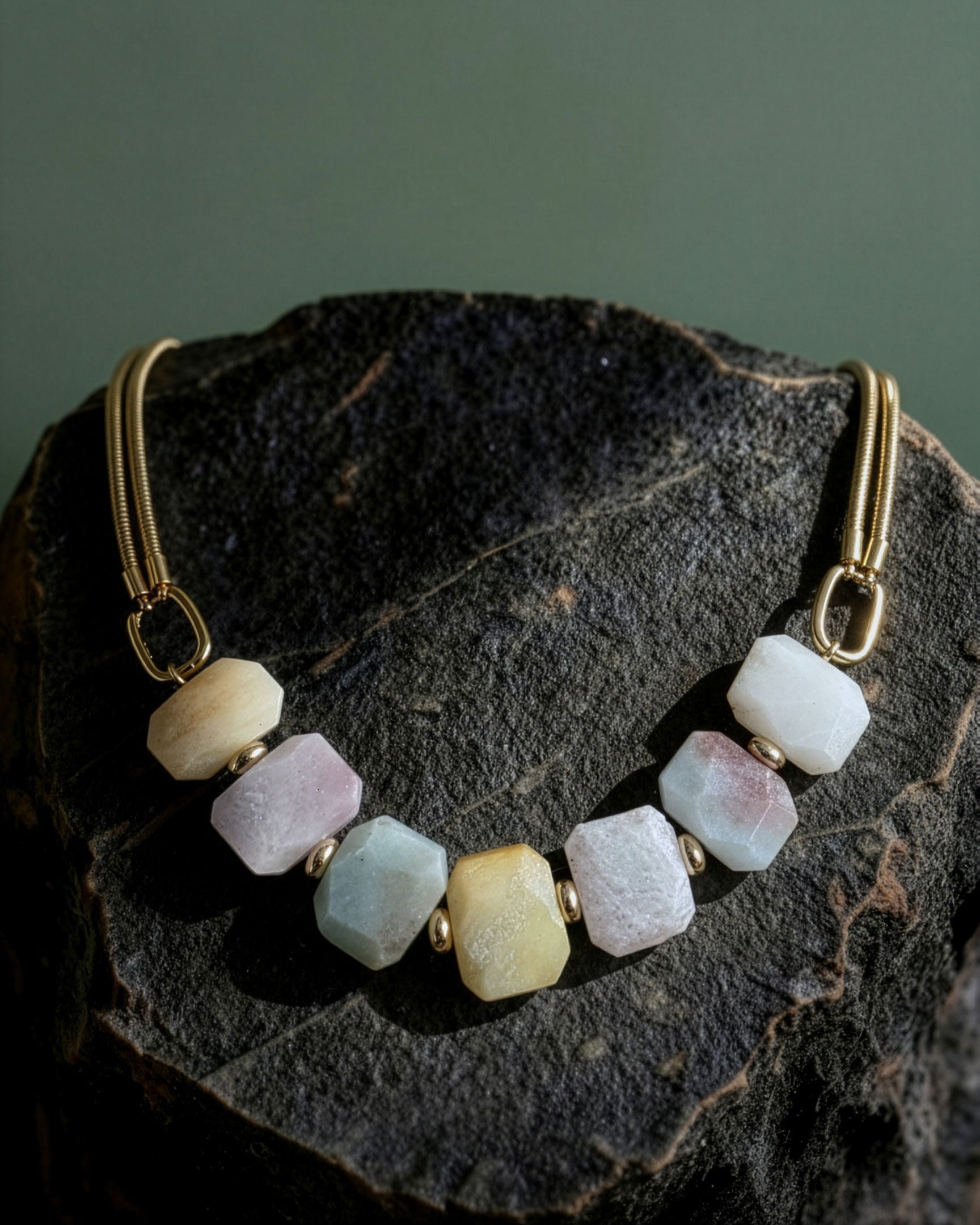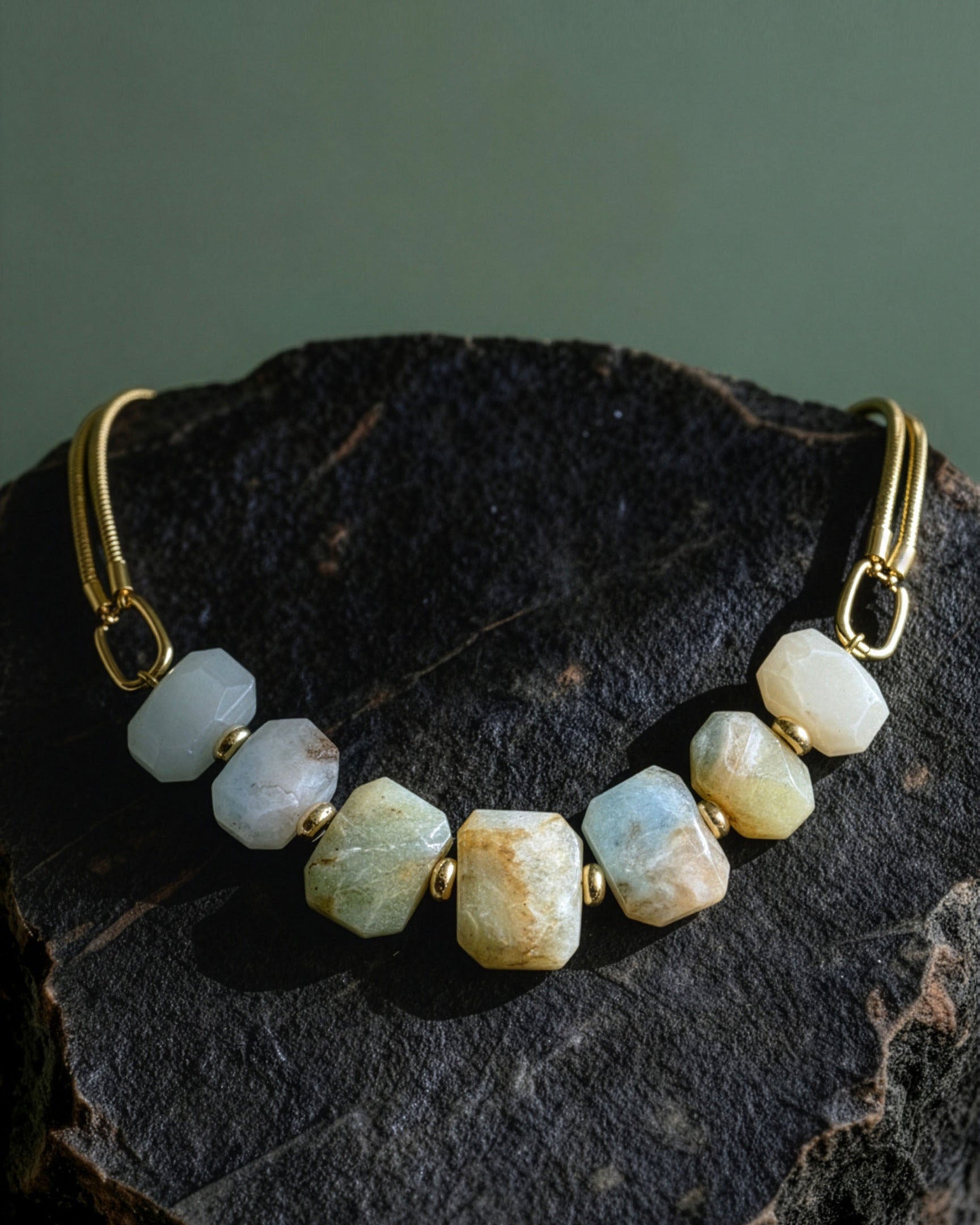 שרשרת אבני אמזונייט טבעיות בגוונים ובמרקמים משתנים, בשילוב אלמנטים מוזהבים.
