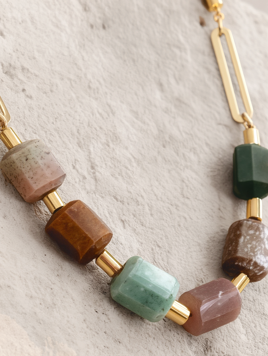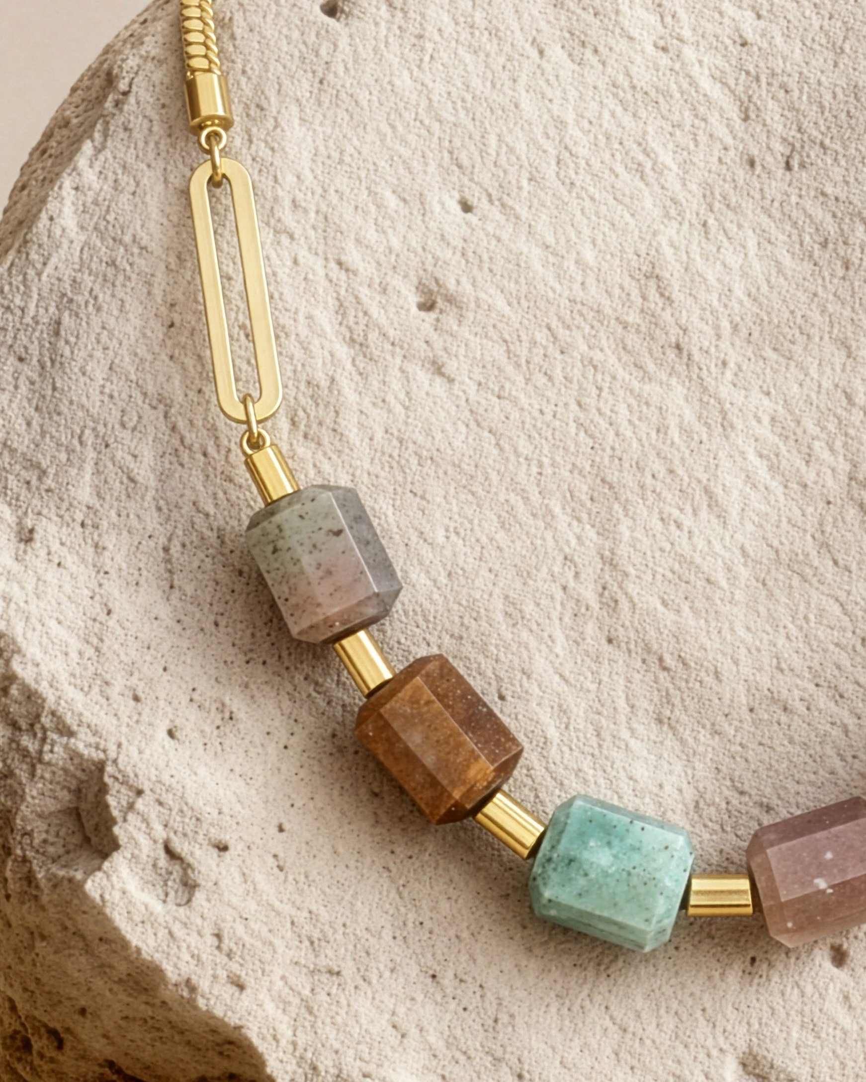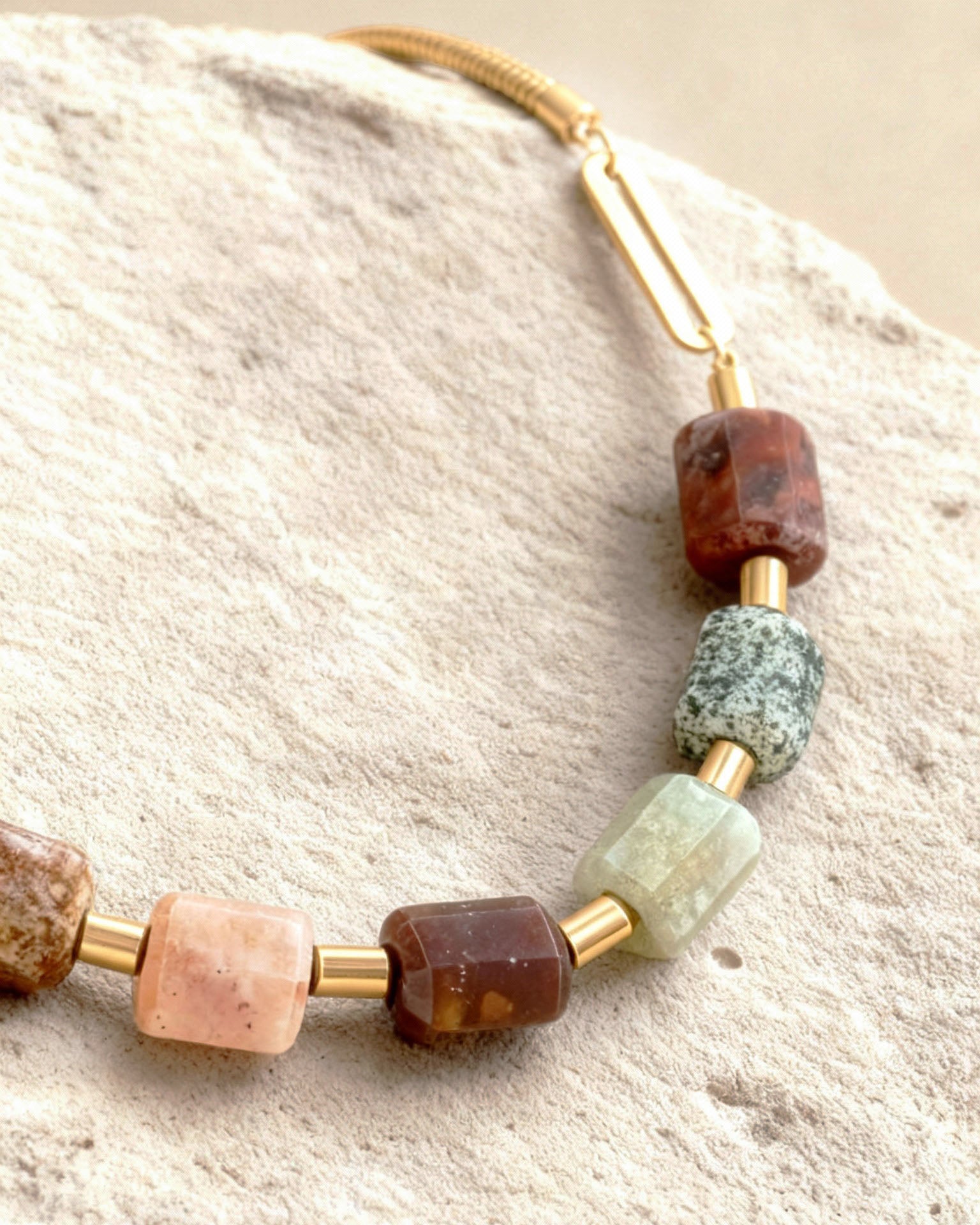 שרשרת אבנים טבעיות מסוגים שונים, בשילוב אלמנטים מוזהבים.