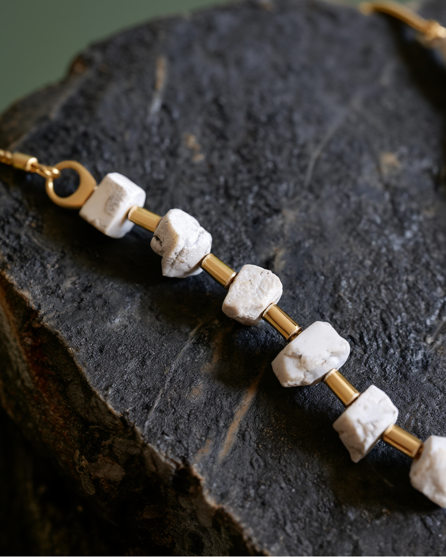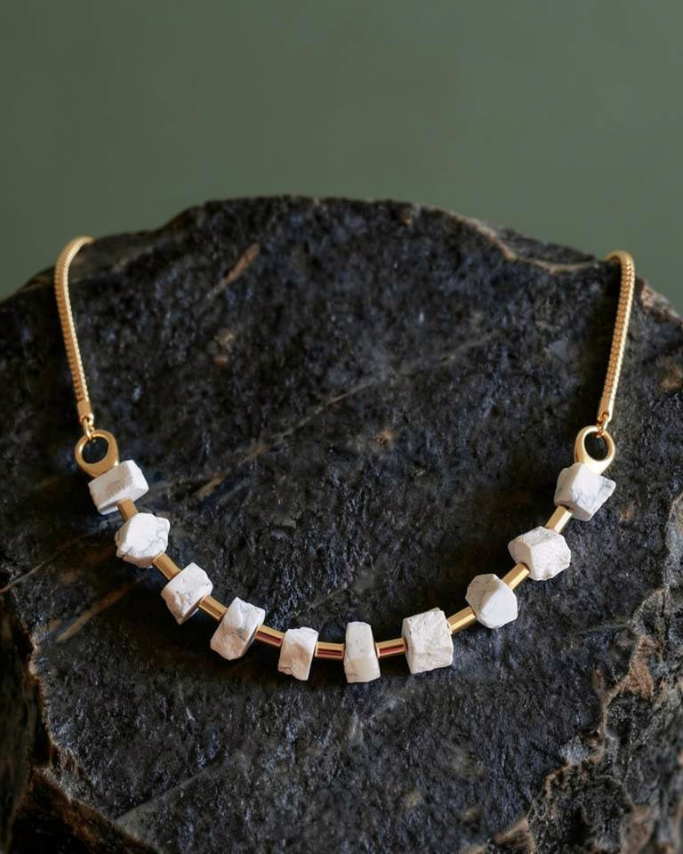 שרשרת אבני האולייט טבעיות בגימור גולמי, בשילוב אלמנטים מוזהבים.