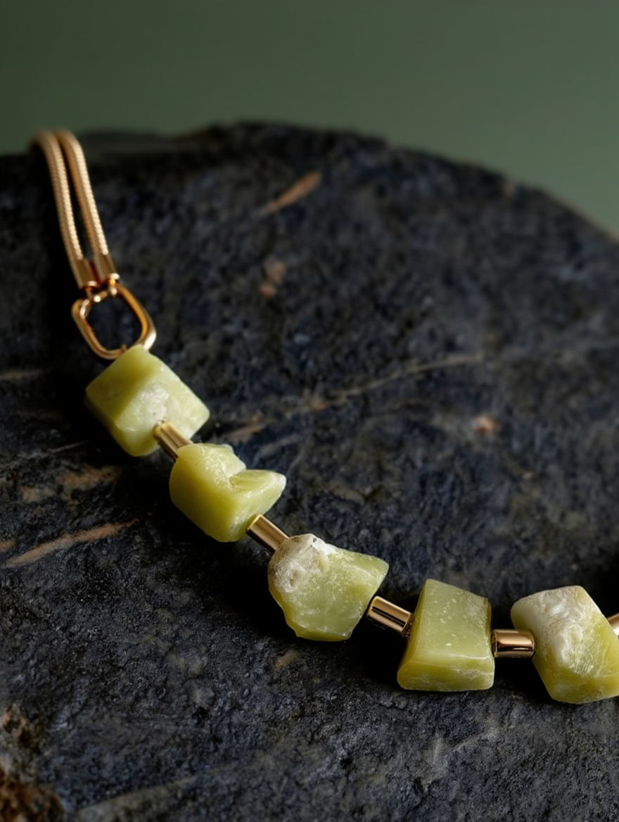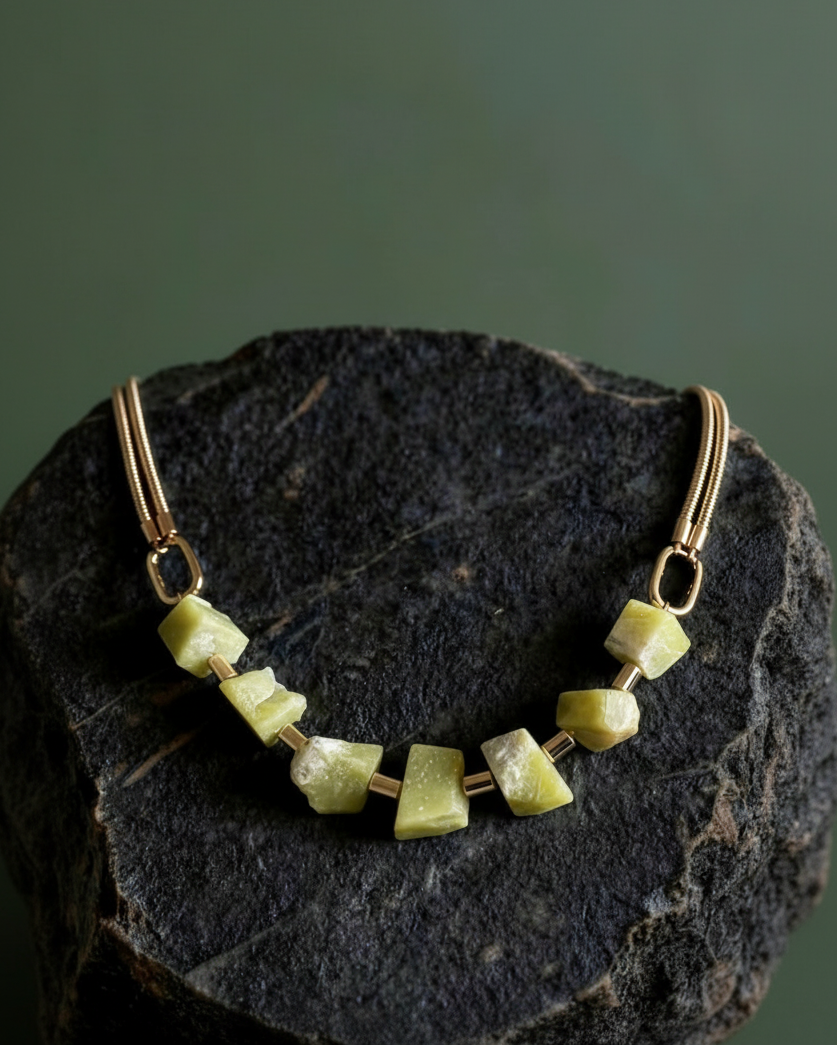 שרשרת אבני ג'ייד לימוני בגימור גולמי, בשילוב אלמנטים מוזהבים.