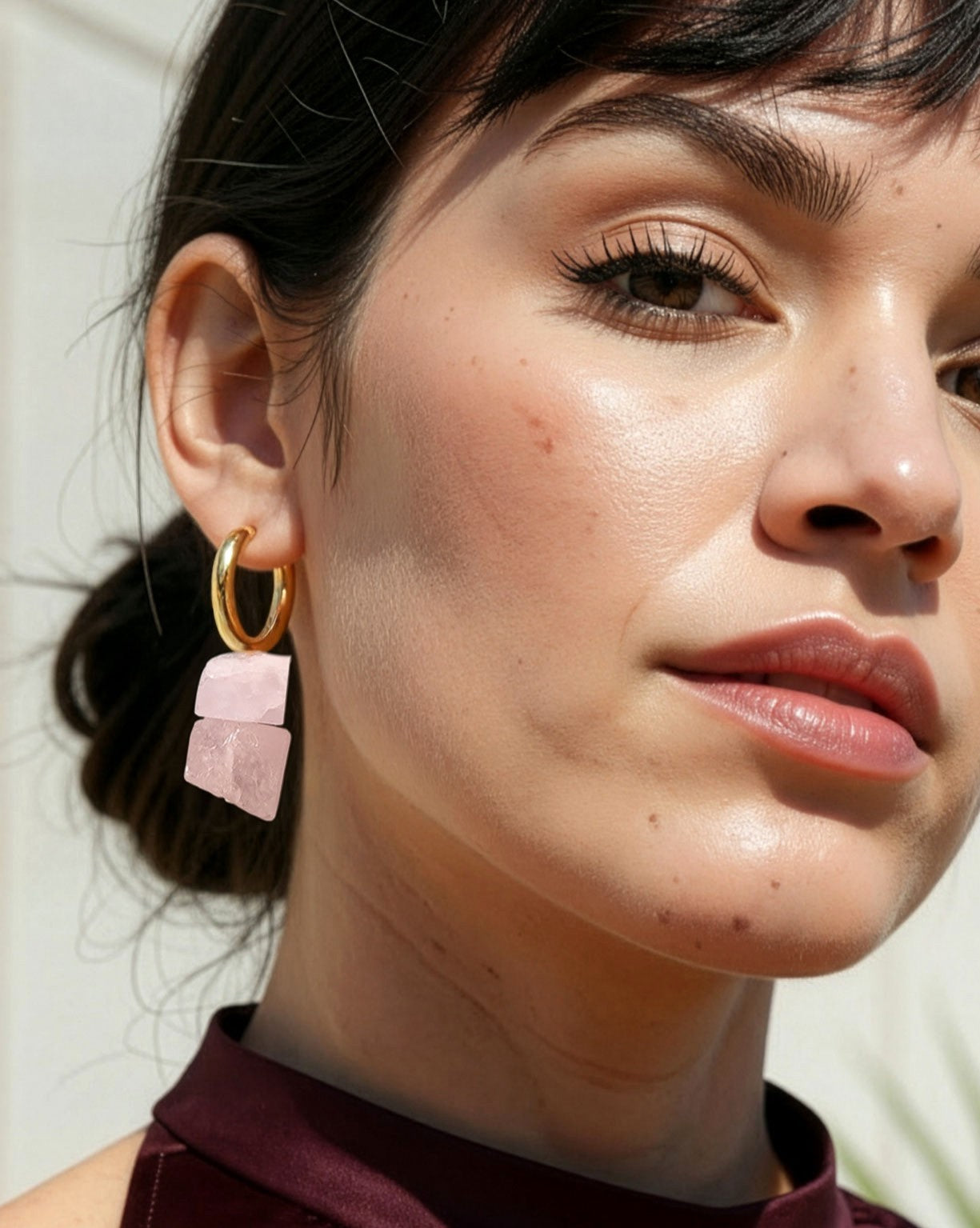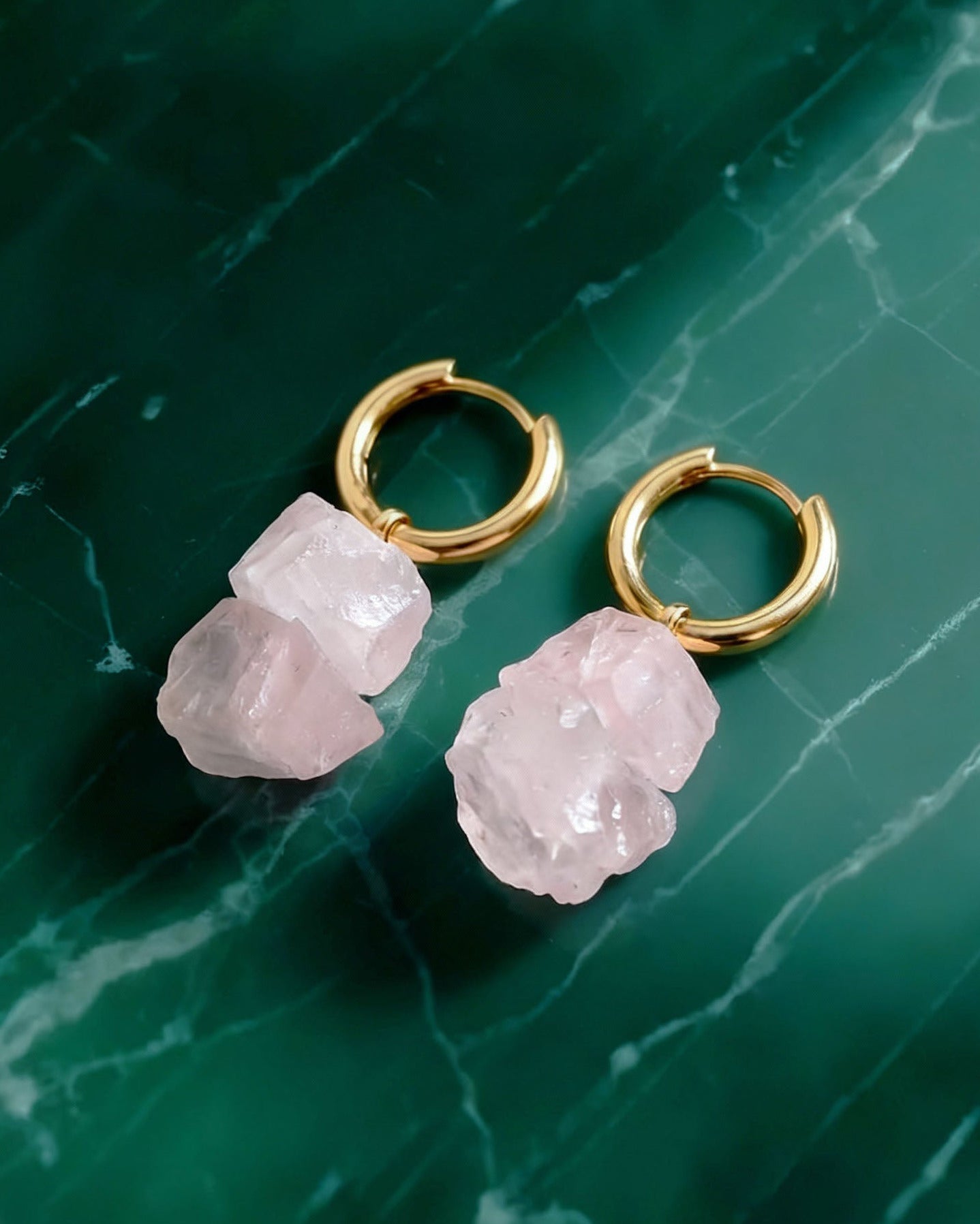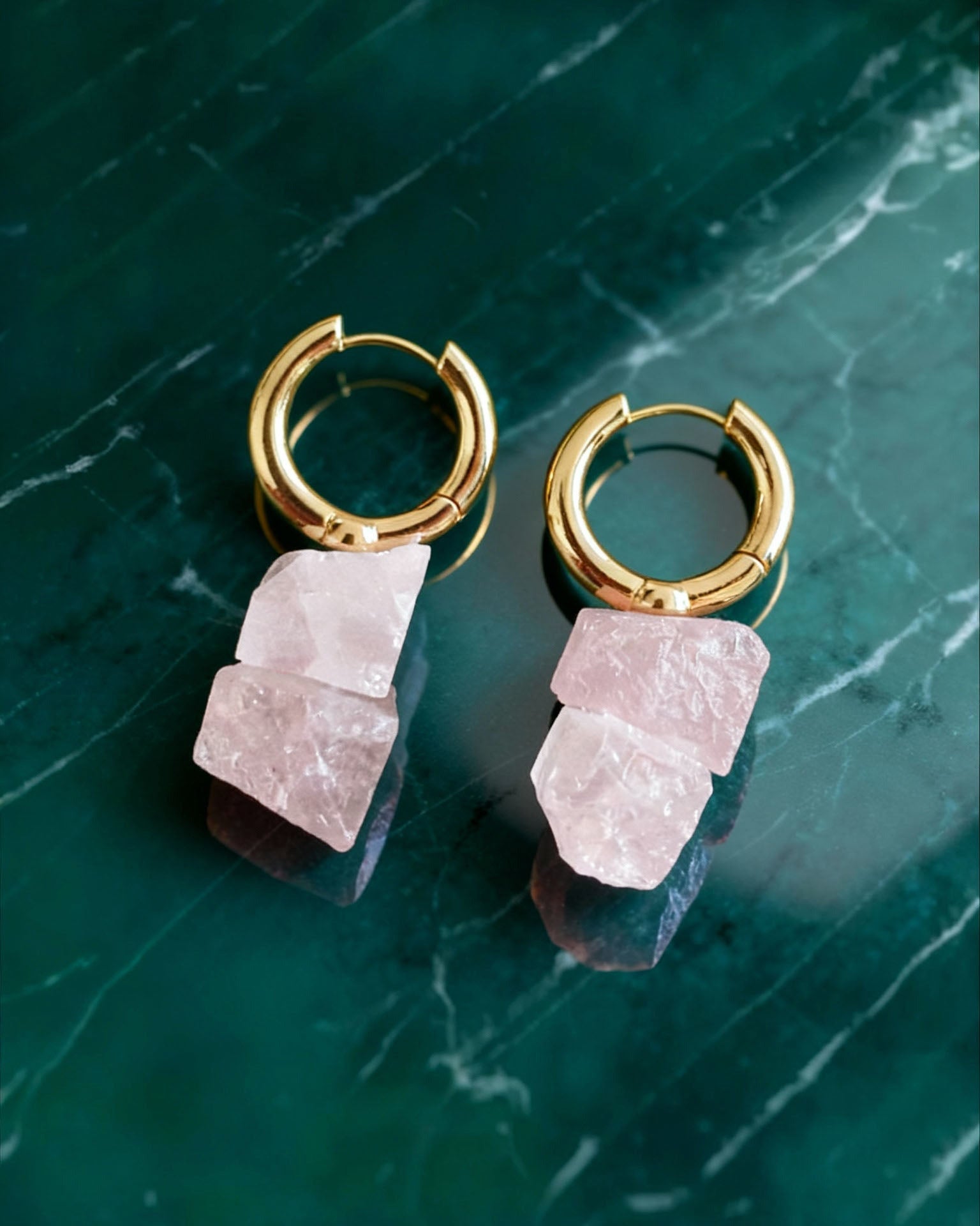 עגילי חישוק זהובים בשילוב אבני רוז קוורץ בחיתוך גולמי.