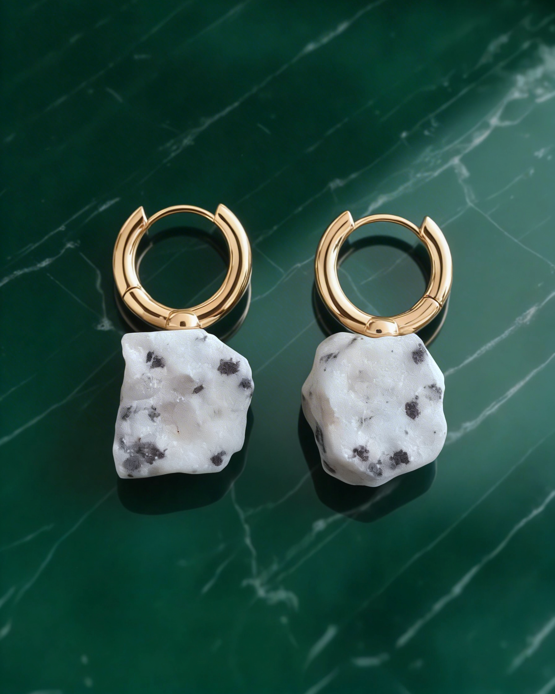 עגילי חישוק זהובים בשילוב אבני ג'ספר שומשום, הידועות גם בשמן אבני קיווי..