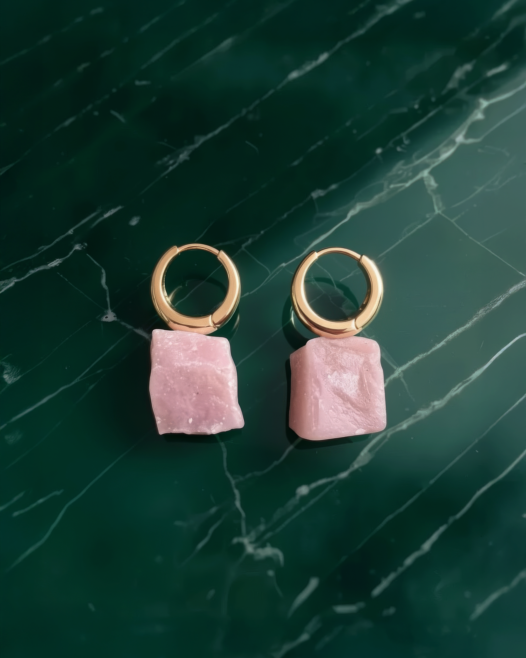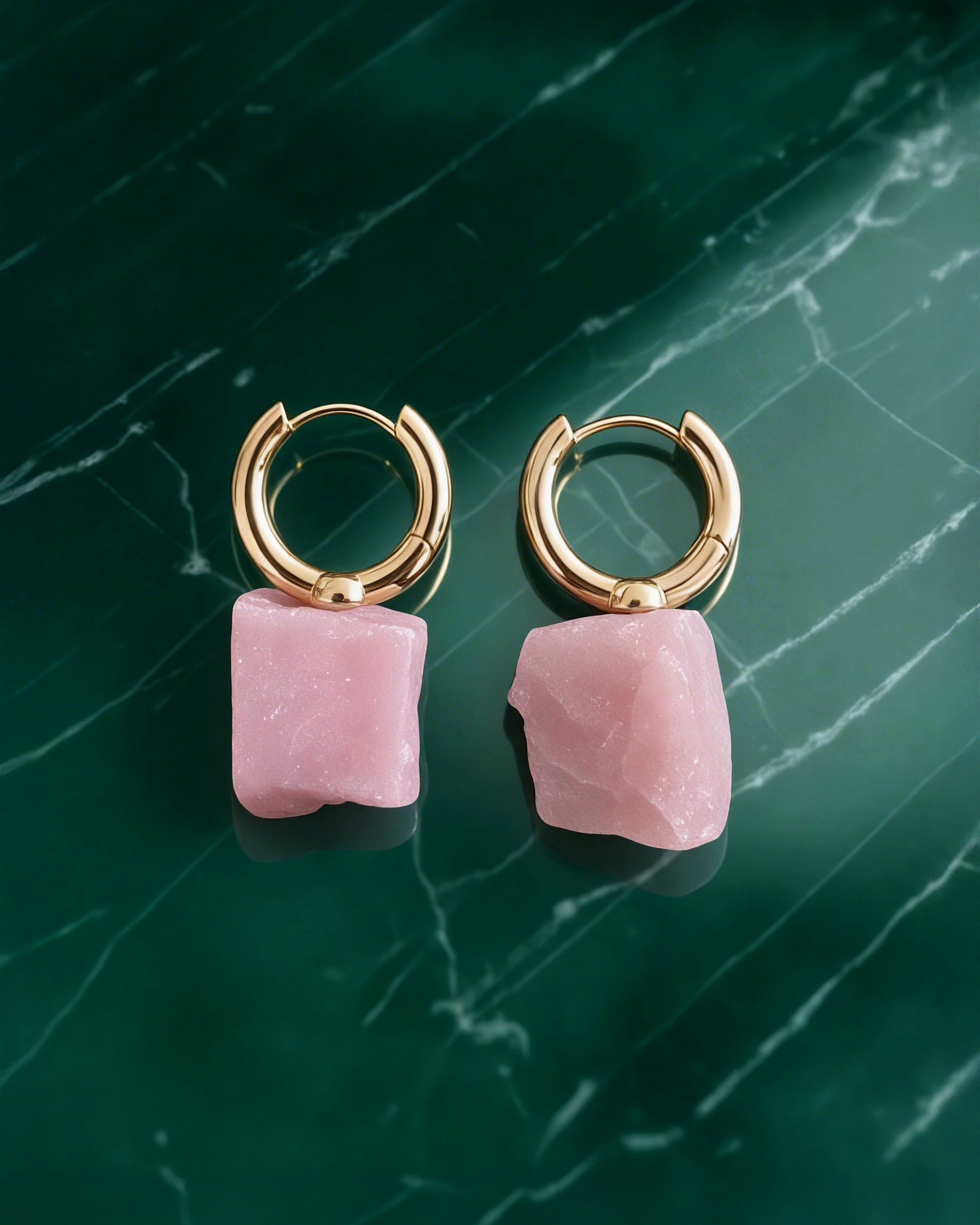 עגילי חישוק זהובים בשילוב אבני אופל ורוד.